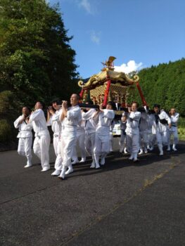 昭和初期より氏子地域(旧中谷村、約250戸)を御巡幸。巡行先の御旅所で24名の輿守は振る舞い酒を飲み明かし三日三晩練り歩いた。御巡幸の工程は述べ三里(12キロ)にも及び、現在ではとても考えられない距離である。氏子地域は限界集落化が顕著であり、氏子以外の輿守は認めていないにも拘わらず例年不足したことはない。それほど輿守ができる事に有難味を感じている。