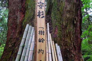 参道に聳える二股の杉は樹齢千年と言われ、平安杉と呼ばれている。